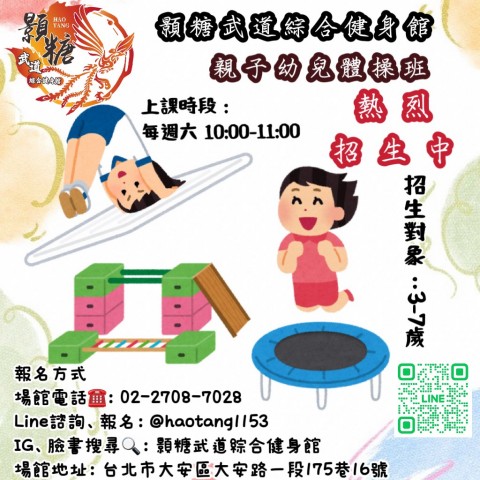 我們這裡有防身術、跆拳道、親子體操、幼兒體操......等多元化才藝課程,提供孩子們一個安全歡樂活動的空間。同時也提供場地租借共享空間。
